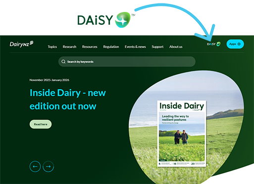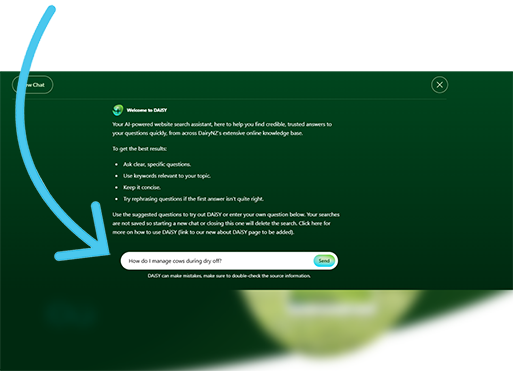 DAiSY is our new AI-powered website assistant, designed to make it easier to find the information you need from across the DairyNZ website. DAiSY can quickly access trusted answers from our extensive online knowledge base - so you spend less time searching and more time getting things done.
