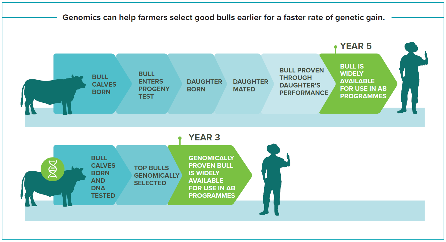 Because we can pinpoint good bulls sooner, farmers can achieve a genetic gain faster in their herd when they use genomic-tested bulls in their breeding programme.