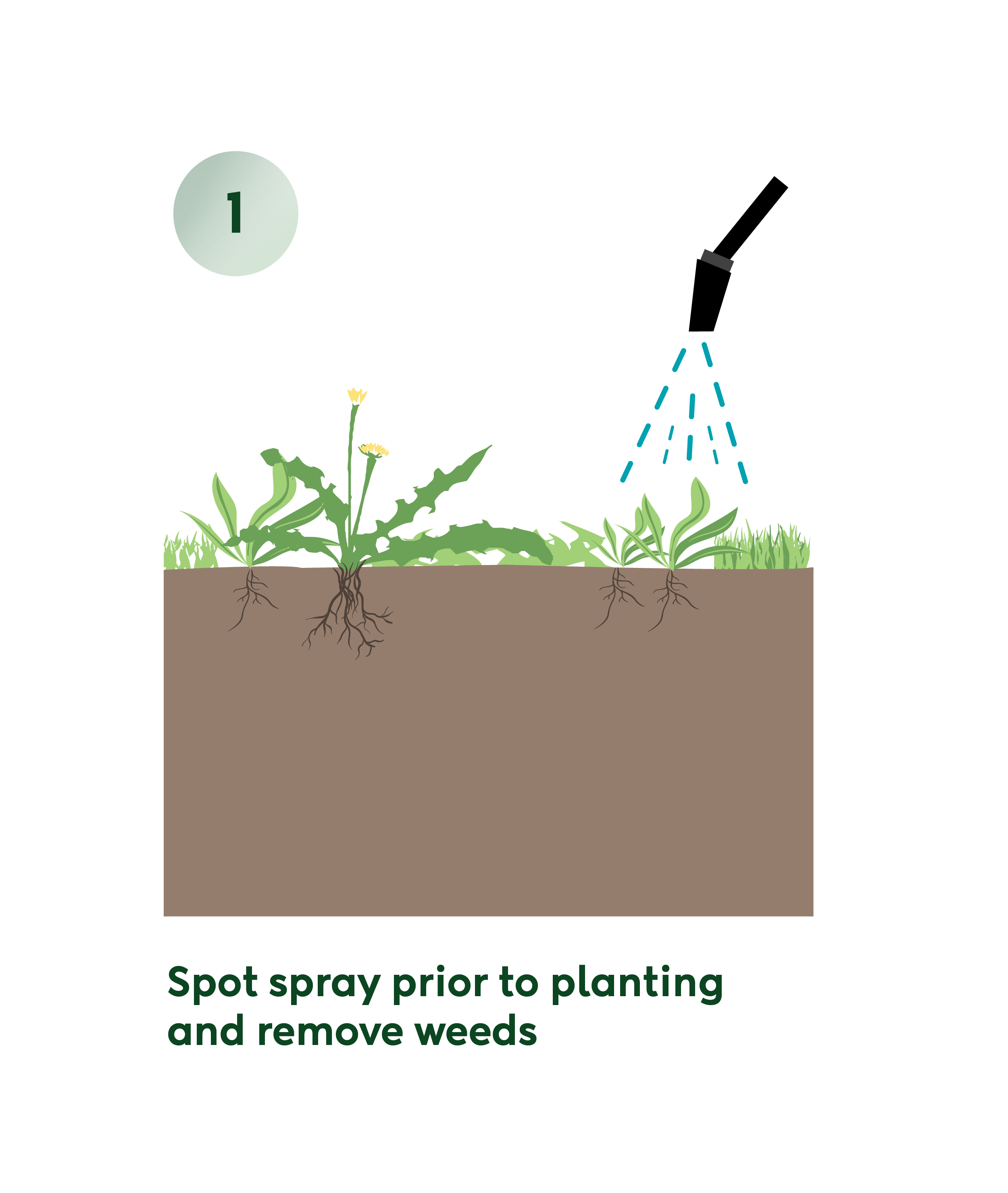 Control weeds twice a year by brush cutting, hand weeding, or careful glyphosate spraying. If spraying, follow product guidelines - desired plants are usually sensitive to herbicides, so caution must be taken to protect against spray drift.