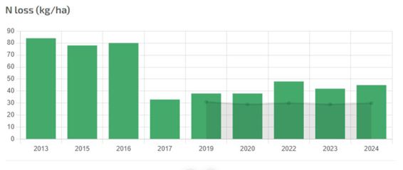 The analysis found that across about 302,000 hectares of dairy production land, the mean nitrogen loss per hectare in 2016-17 was 63.8 kg per hectare. This had reduced to 46.2 kg per hectare in 2021-22.